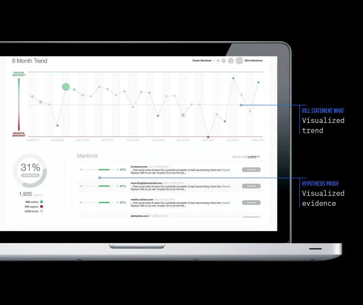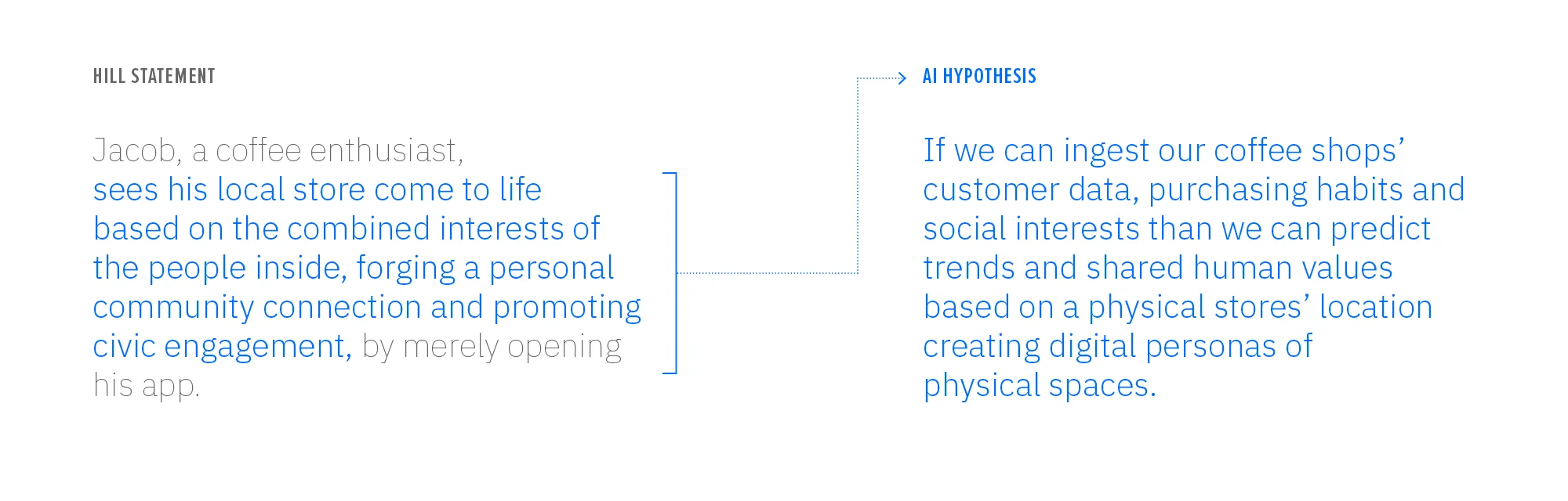 Using the Hill statement we defined in our workshop sessions, we start to prototype an experience built around the Hill’s core tenets. Functionality, technology, and AI decision are based entirely on achieving our hypothesis in context to our user.