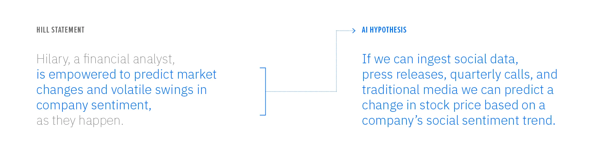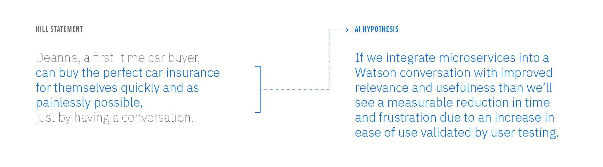 Our team’s goal walking out of any Design Thinking session with Watson is a precise definition of the experience — a Hill or commander’s intent matched with data and insights that form the building blocks of our application. We can take the output of the Design Thinking sessions and focus on what we discovered. The ‘what’ of our Hill statement is the seed basis for our data hypothesis — which will leverage the data we identified or deliver the insights we outlined.